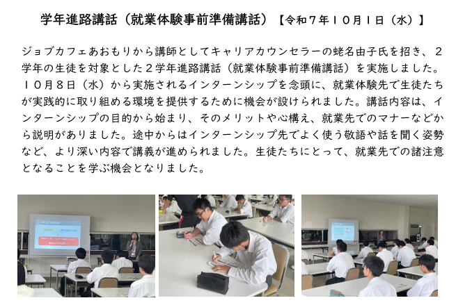 9月13日からの2学年生徒のインターンシップに先駆けて、ジョブカフェあおもりから講師を招いて、就業体験事前準備講話を実施しました。働く上で必要な心構えや、マナー・ルールを確認し、適切な体験ができるように、熱心に話を聞き、挨拶の練習も大きな声で行っていました。